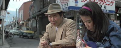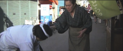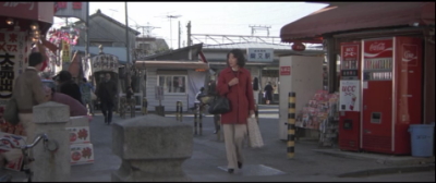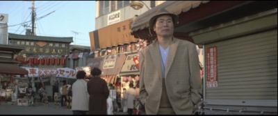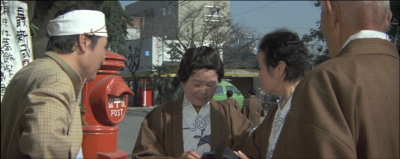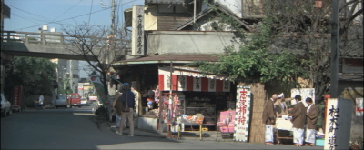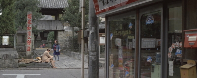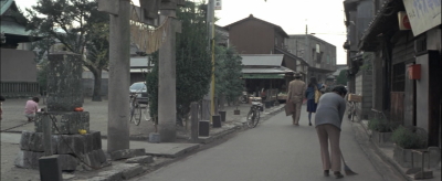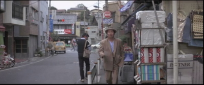 とらやの前。背景のシャッターの降りている店はシリーズの間ずっと閉まったままで現在も閉まっている。
