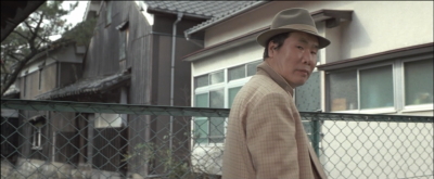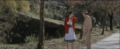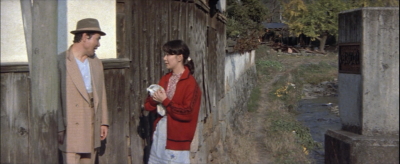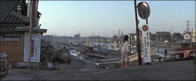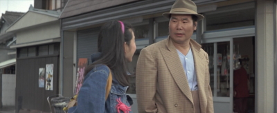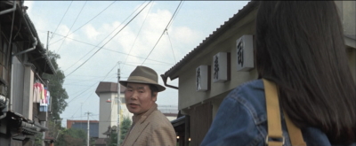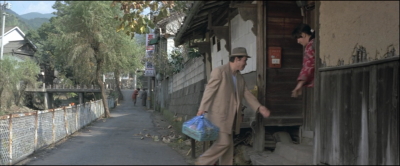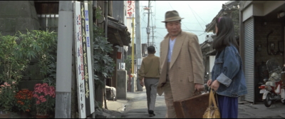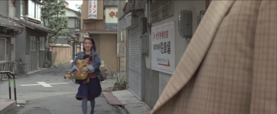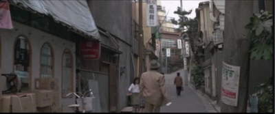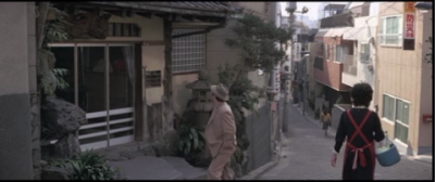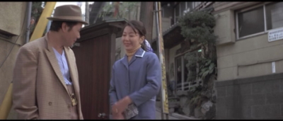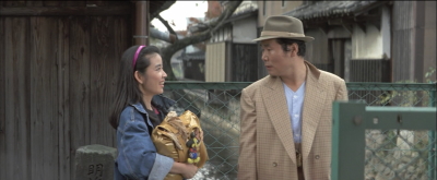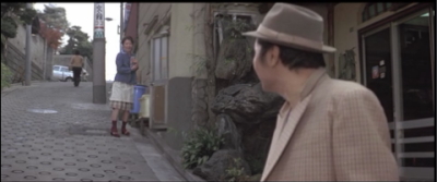 愛子と一旦別れた寅さんが歩いていると曲がり角から愛子が飛びだしてくる。その直前のシーン。
