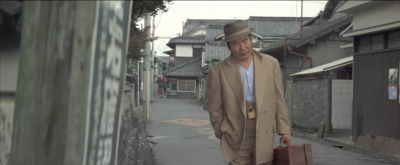同じく秋月中学校前。常三郎はここの中学校を卒業したんだと光枝が寅さんに話しながら歩いている>