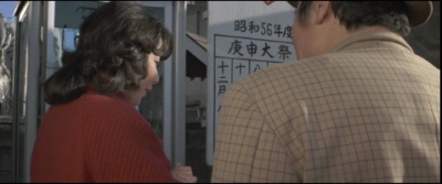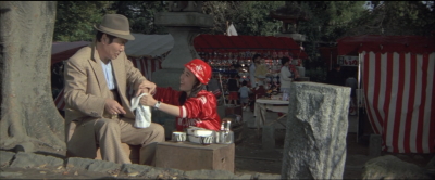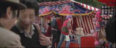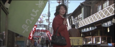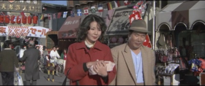 とらやの前で光枝がとらさんを待つシーン。向かいの「い志い」はこの頃は軒が白い菱形模様で特徴があったようだ。