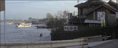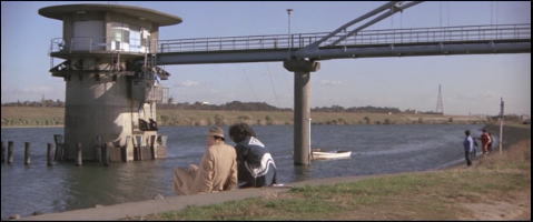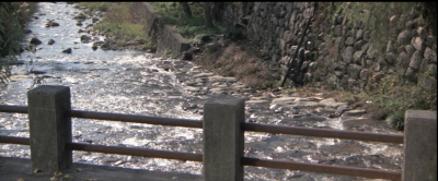 水天宮の側の河原からのシーン。ロケはおそらく秋にされたと思うが、冬に撮影した今回の方が木の緑が多い。