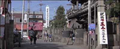 寅さんと愛子が歩いて行くシーン。左が月読神社。2人が向かっている道の向こうの茶色の三角屋根の建物が勇寿司