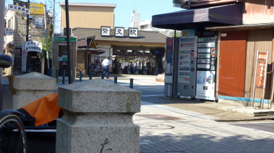 右側の店頭で雑誌を売っている店は今は不動産屋になっている。駅の看板が当時とは変わっている。