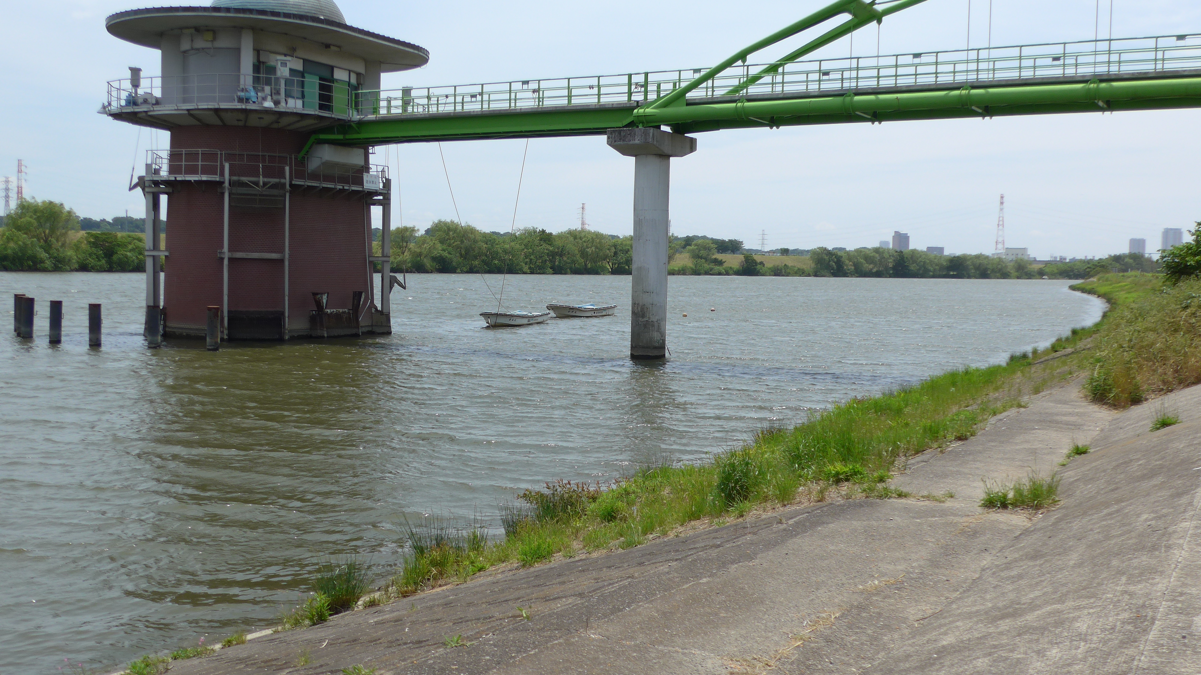 ロケをした頃はなかった植栽が今はあり土手の道の方は見えない。