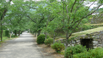 朝倉市立秋月中学校の前。桜並木。映画のロケは秋だったが桜の季節にはきれいに違いない。