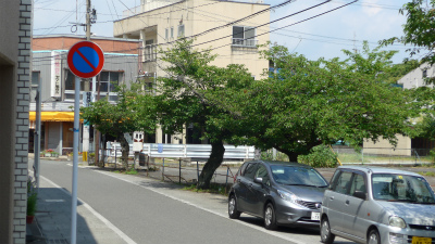 章文館の向かいの建物の駐車スペースだったと思われる。現在はその建物が建て変わって駐車場になっている。
