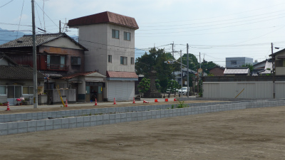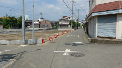 その後、区画整理後、東京屋が移転したのは後方に見えるピンクの看板のホームメイトという不動産屋が入っている所。
